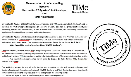 In het kader van het samenwerkingsproject Makam Peneleh as a Living Library heeft de Universitas 17 Agustus 1945 (UNTAG) Surabaya Indonesia het initiatief genomen om een aanvullende samenwerkingsovereenkomst op te stellen. Daartoe is onlangs een nieuwe Memory of Understanding door TiMe Amsterdam getekend. De samenwerking zal verder worden uitgewerkt en zal de komende drie jaar bestrijken. TiMe Amsterdam zal (online) bijdragen leveren vanuit Nederland, informatie, kennis en (koloniale) erfgoedconcepten delen die van belang zijn voor onderzoek en onderwijs in Indonesië. TiMe Amsterdam zal gebruik kunnen maken van het (informatie)netwerk van Untag. Petra Timmer, PhD, is primair verantwoordelijk voor de ontwikkeling van deze internationale academische samenwerking.